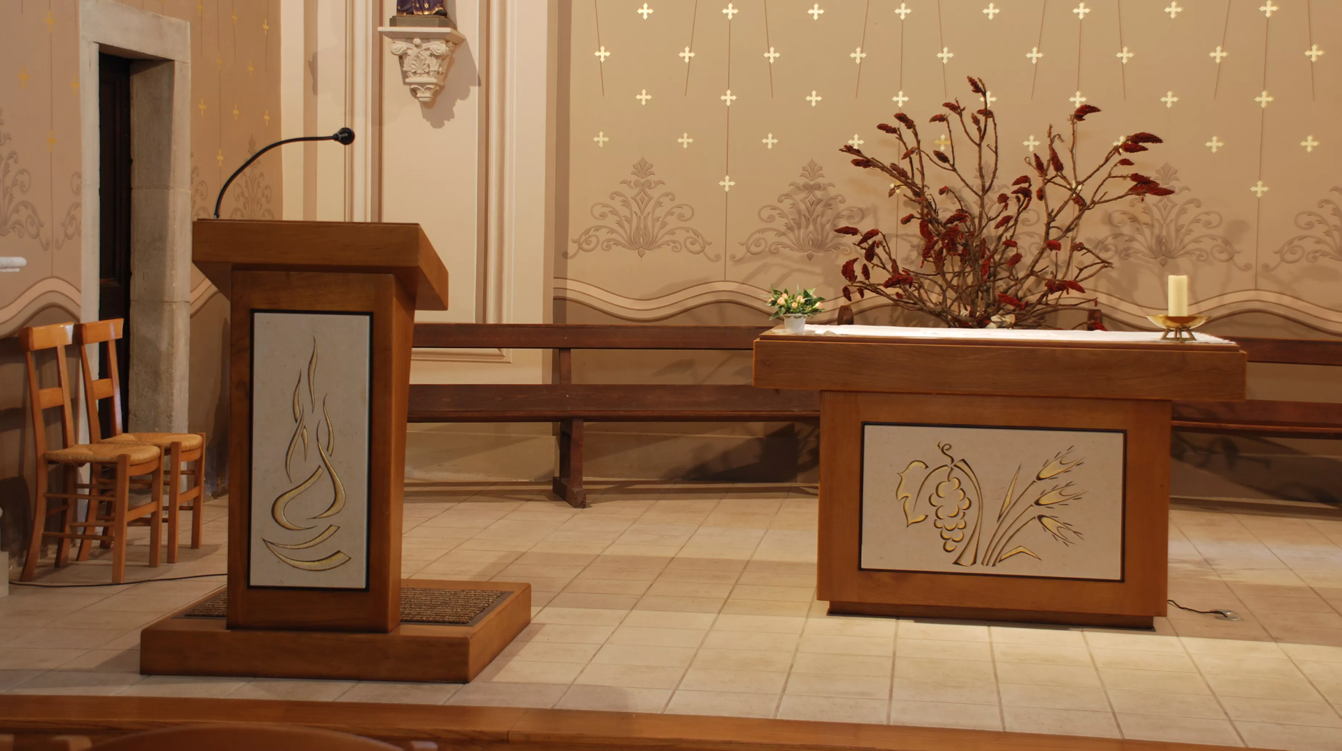 L’autel, l’ambon, le pupitre et le siège ont demandé pas moins de 2.5 tonnes de marbre blanc bleuté de Savoie . Rehaussés d’ornements symboliques dorés à l’or fin, ils ornent le chœur de l’édifice religieux de Sevrier depuis 2008.
